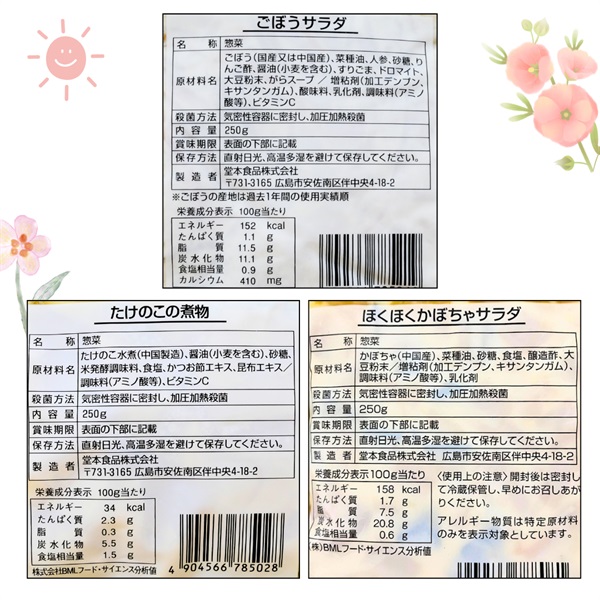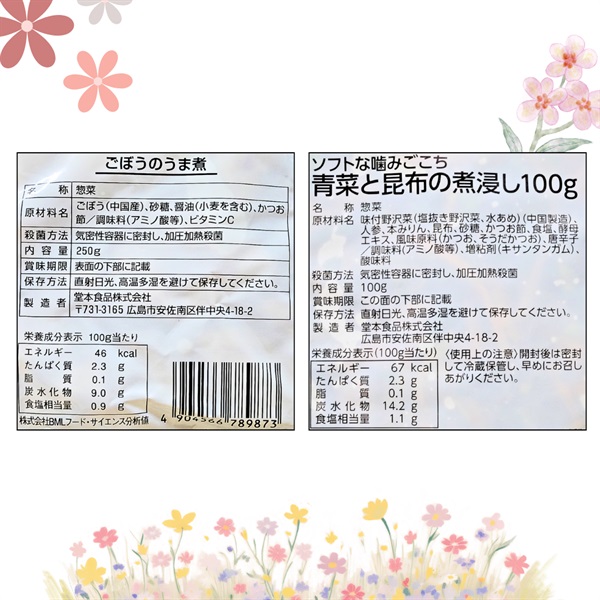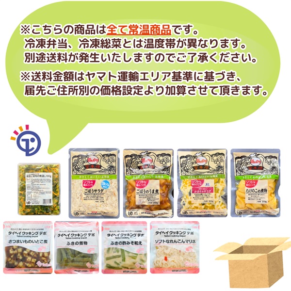 ☆セット内容☆(全商品:UDF区分:容易に噛める)さつまいもいとこ煮120gふきの煮物150gふきの酢みそあえ150gレンコンマリネ150gメーカー:タイヘイ株式会社ごぼうサラダ250gたけのこの煮物250gごぼうの旨煮250gかぼちゃサラダ250g青菜と昆布の煮浸し100gメーカー:堂本食品株式会社※こちらの商品は全て常温商品です。 冷凍弁当、冷凍総菜とは温度帯が異なります。 別途送料が発生いたしますのでご了承ください。※送料金額は配送委託先ヤマト運輸エリア基準に基づき、 お届け先ご住所別の価格設定より加算させて頂きます。※常温商品 3,240円(税込)以上お買い上げで送料無料となります。
