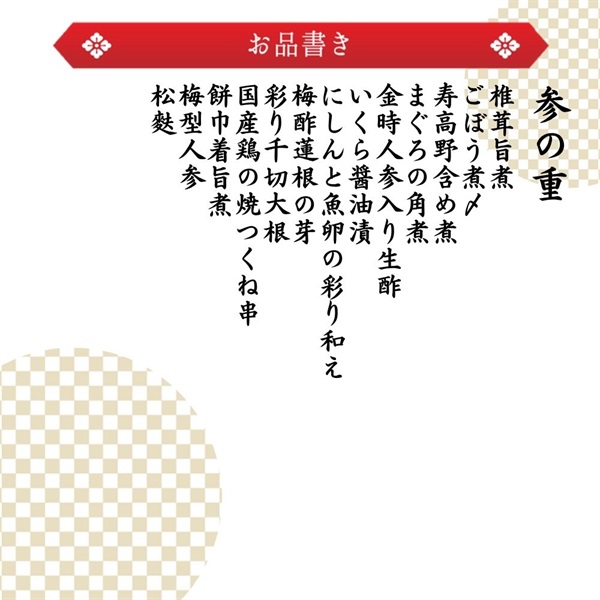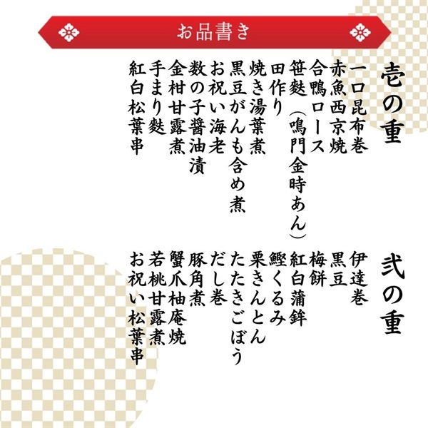 おせち「桂」【内容】<一の重>一口昆布巻4個赤魚西京焼3切合鴨ロース50g笹麩(鳴門金時あん)3個田作り15g焼き湯葉煮3個黒豆がんも含め煮3個お祝い海老4尾数の子醤油漬4切金柑甘露煮2個手まり麩2個紅白松葉串1本<二の重>伊達巻4切黒豆55g梅餅1個紅白蒲鉾4切鰹くるみ45g栗きんとん70gたたきごぼう45gだし巻4切豚角煮5切蟹爪柚庵焼3個若桃甘露煮2個お祝い松葉串1本<三の重>椎茸旨煮4個ごぼう煮〆3個寿高野含め煮3個まぐろの角煮65g金時人参入り生酢50gいくら醤油漬3gにしんと魚卵の彩り和え50g梅酢蓮根の芽45g彩り千切大根25g国産鶏の焼つくね串2本餅巾着旨煮3個梅型人参2個松麩2個