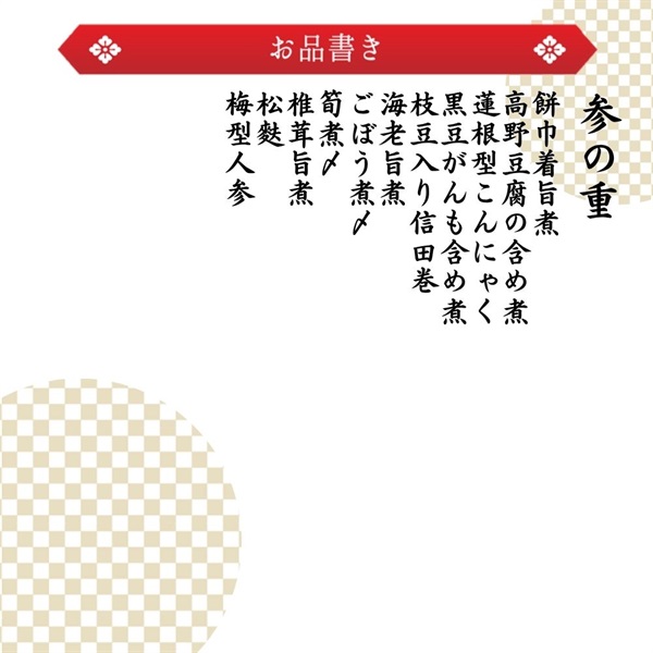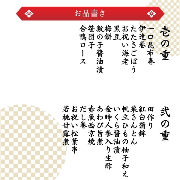 おせち「八坂」【内容】<一の重>一口昆布巻3個伊達巻3切たたきごぼう40gお祝い海老3尾黒豆45g梅餅1個数の子醤油漬3切笹団子2個合鴨ロース3切<二の重>田作り15g紅白蒲鉾3切栗きんとん70g帆立ひもの柚子和え25gいくら醤油漬3g金時人参入り生酢40gあわび旨煮2個赤魚西京焼2切だし巻2切お祝い松葉串1本若桃甘露煮1個<三の重>餅巾着旨煮3個高野豆腐の含め煮3個蓮根型こんにゃく3個黒豆がんも含め煮3個枝豆入り信田巻2切海老旨煮3尾ごぼう煮〆3個筍煮〆3個椎茸旨煮3個松麩2個梅型人参2個