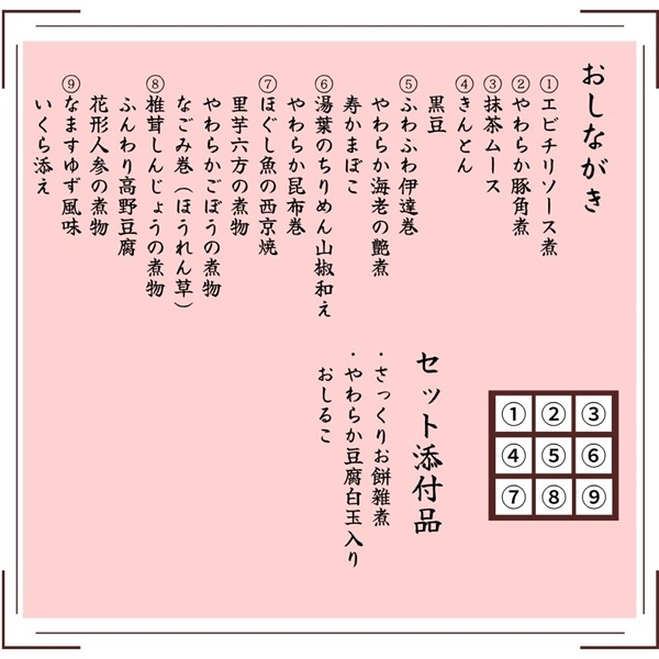 やわらかおせち重セット【内容】①エビチリソース煮②やわらか豚角煮③抹茶ムース④きんとん 黒豆⑤ふわふわ伊達巻 やわらか海老の艶煮 寿かまぼこ⑥湯葉のちりめん山椒和え やわらか昆布巻⑦ほぐし魚の西京焼 里芋六方の煮物 やわらかごぼうの煮物 なごみ巻(ほうれん草)⑧椎茸しんじょうの煮物 ふんわり高野豆腐 花形人参の煮物⑨なますゆず風味 いくら添え【セット添付品】・さっくりお餅雑煮・やわらか豆腐白玉入りおしるこ