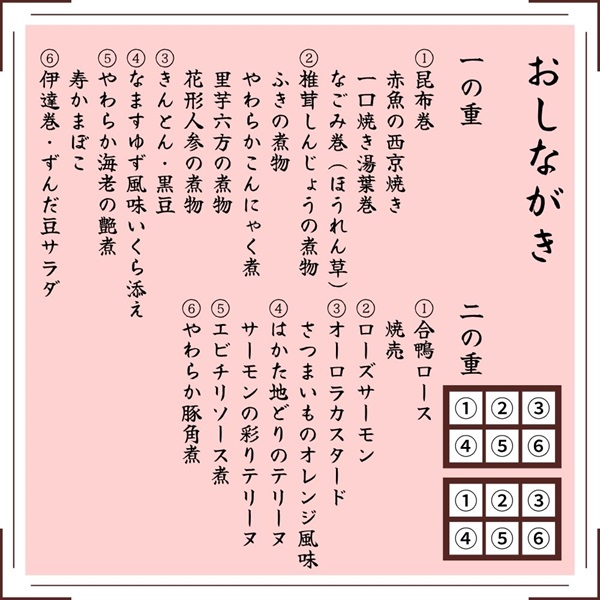 やわらかおせち 二段重【内容】<一の重>①昆布巻 赤魚の西京焼き 一口焼き湯葉巻 なごみ巻(ほうれん草)②椎茸しんじょうの煮物 ふきの煮物 やわらかこんにゃく煮 里芋六方の煮物 花形人参の煮物③きんとん 黒豆④なます ゆず風味 いくら添え⑤やわらか海老の艶煮 寿かまぼこ⑥伊達巻 ずんだ豆サラダ<ニの重>①合鴨ロース 焼売②ローズサーモン③オーロラカスタード さつまいものオレンジ風味④はかた地どりのテリーヌ サーモンの彩りテリーヌ⑤エビチリソース煮⑥やわらか豚角煮