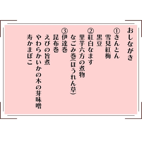 やわらかおせち「幸」【内容】①きんとん 20g 雪見紅梅 1個 黒豆 20g ②紅白なます 30g 里芋六方の煮物 1個 なごみ巻(ほうれん草) 1切 ③伊達巻 1切 昆布巻 1個 えびの旨煮 1尾 やわらかいかの木の芽味噌 1切 寿かまぼこ 1切