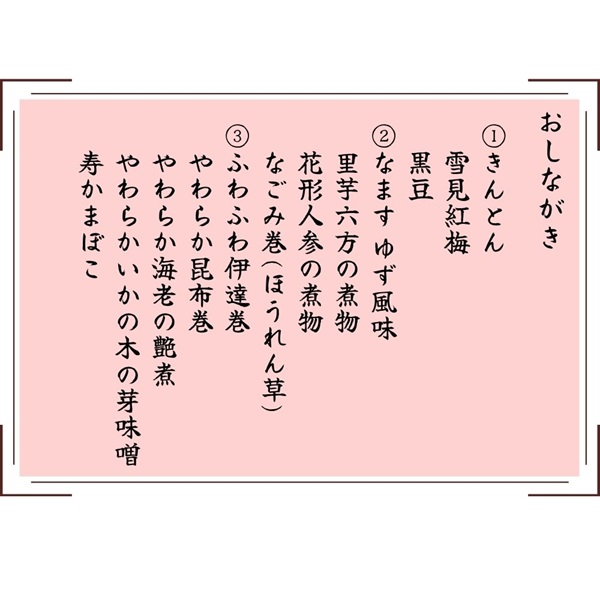 やわらかおせち「優」【内容】①きんとん 20g雪見紅梅 1枚黒豆 20g②なます ゆず風味 25g里芋六方の煮物 1個花形人参の煮物 1個なごみ巻(ほうれん草) 1切③ふわふわ伊達巻 1切やわらか昆布巻 1個やわらか海老の艶煮 1尾やわらかいかの木の芽味噌 1切寿かまぼこ 1切