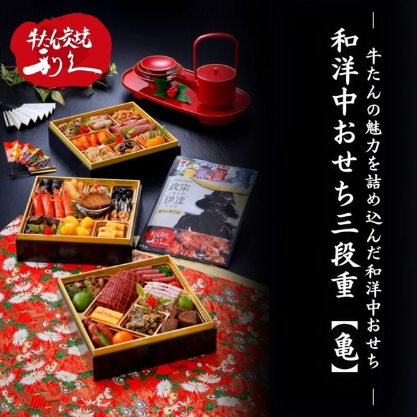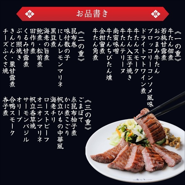 和洋中おせち三段重【亀】【内容】<一の重>牛たん佃煮35g若桃甘露煮2個おつまみ牛たん4枚ブロッコリーコンソメ風味1個ドライトマトワイン煮1個牛たんスモーク1個牛たん入玉子焼き1個牛たんテリーヌ4個南蛮味噌35g牛たんちびたん燻4個金柑蜜煮1個牛たん角煮4個<二の重>昆布巻4個味付数の子4本にしんレモンマリネ40g黒豆煮40g海老の旨煮4尾鮑煮1個松前煮35g田作り煮10gくるみ甘露煮15gぶり照焼き4切きんとん60g栗甘露煮4個チーズふくさ焼4切<三の重>ごまぽて4個糸昆布柚子煮10gかに煮こごり4切帆立ひもの中華風40g海老チリ4尾ローストビーフ4枚オニオンマリネ35g帆立香草焼4個サーモンバジル50gオリーブ2個合鴨スモーク4枚杏子煮2個<別添付>牛たん真空パック(塩味)3枚