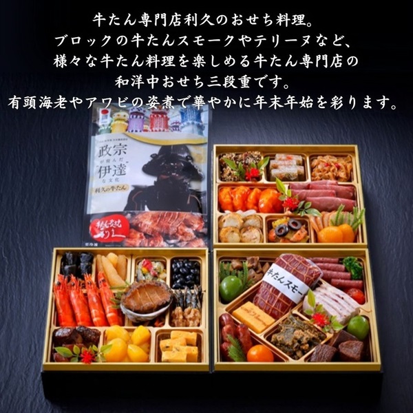 牛たん専門店利久のおせち料理。一の重では、ブロックの牛たんスモークやテリーヌなど様々な牛たん料理を、二の重では有頭海老やアワビの姿煮等の華やかなお正月料理、三の重ではローストビーフや海老チリ等の豪華なお料理が楽しめます。別添の牛たん真空パック付きで3~4人前に最適な逸品です。
